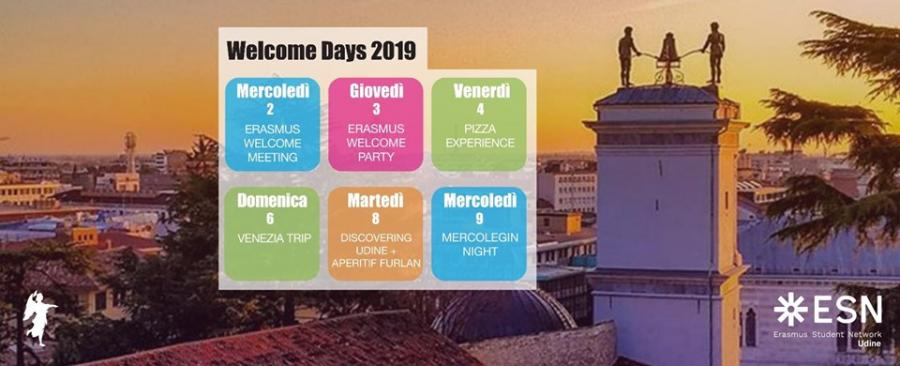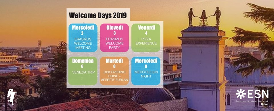 Presentazione e saluti da parte delle istituzioni e di ESN Udine. Avremo il piacere di accogliervi con una conferenza durante la quale vi presenteremo tutte le nostre attività e tutto quello che c’è da sapere sull’Università di Udine, sulle associazioni studentesche e sulla città. Tutti i presenti riceveranno una simpatica Welcome Bag e come nostra consuetudine avremo la possibilità di conoscerci meglio ad un buffet e brindare l’inizio di questa nuova avventura tutti insieme!