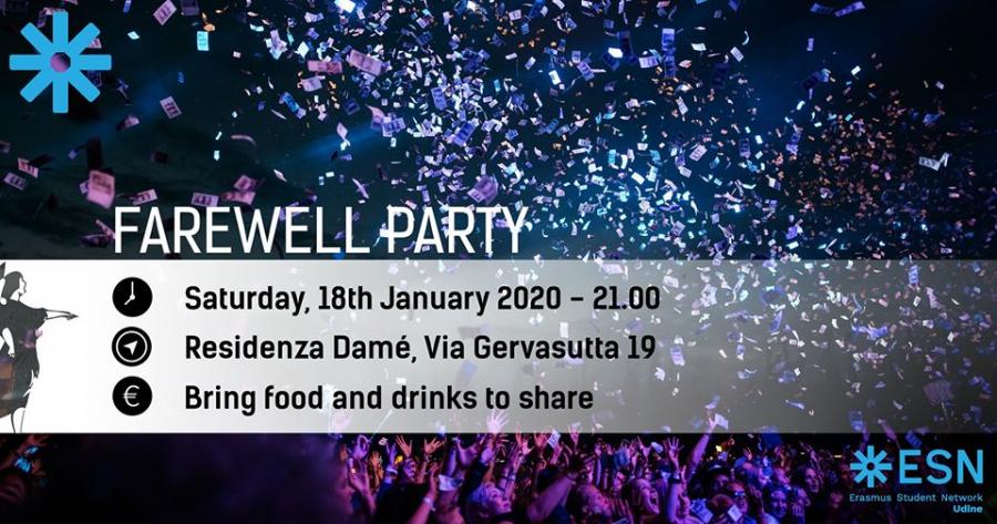 ESN Udine organizza per voi un Gala Farewell Party per dare una degna conclusione a questo fantastico semestre passato insieme. Ci saranno musica e sorprese. Invitiamo ognuno dei partecipanti a portare qualcosa da mangiare e da bere e a scegliere il miglior outfit.
